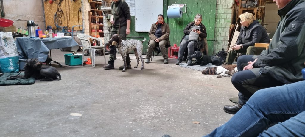 Die Teilnehmer trafen sich in verschiedenen Revieren und Örtlichkeiten rund um Scheeßel. Während des Kurses lernten die Welpen neben vielen jagdlichen Dingen auch, dass Regenschirme nicht böse, auch glatte Matten prima zum Ablegen geeignet und Bademäntel und Halskrausen schwierig anzuziehen sind.